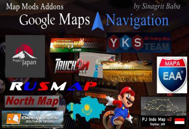 As you all know, the Google Maps Navigation and Google Maps Navigation Night Version mods use the original Euro Truck Simulator 2 map data. Therefore, it does not work properly with map mods. I've only released special versions to ProMods map mod. Now, I have prepared special addons for other map mods. You can now use Google Maps Navigation and Google Maps Navigation Night Version mods with the desired map mod.